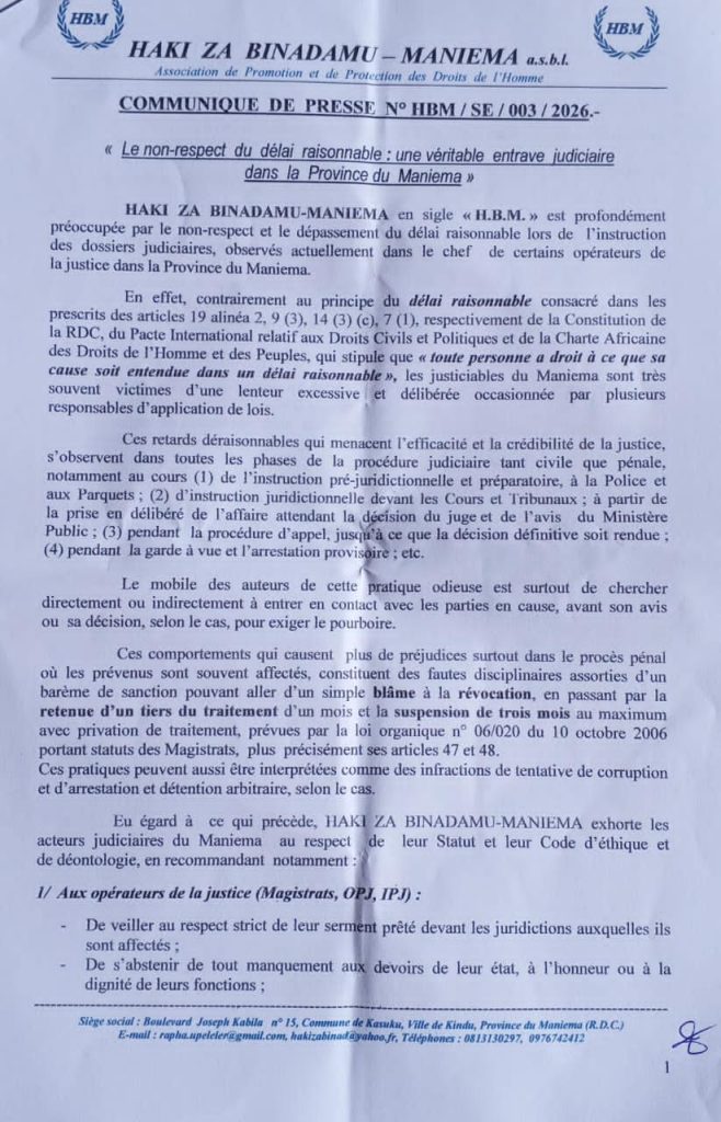 L’association de promotion et de protection des droits de l’homme Haki za Binadamu Maniema se dit profondément préoccupée par le non-respect et le dépassement du délai raisonnable lors de l’instruction des dossiers judiciaires dans la province du Maniema. Elle l’a dit dans un communiqué de presse datant du 06 mars 2026. Pour elle, c’est une entrave judiciaire constatée dans le chef de certains opérateurs de la justice dans la province. Et cela, en violation des articles 19 alinéa 2, 9 alinéa 3, 14 alinéa 3 point c et 7 alinéa 1 de la constitution, du pacte intenational relatif aux droits de civils et politiques et de la charte africaine des droits de l’homme et des peuples.