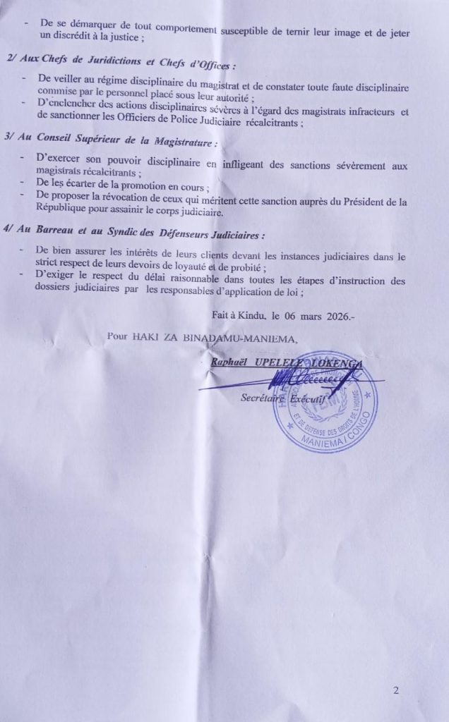 Ainsi, pour pallier à cette situation, Haki za Binadamu Maniema recommande aux magistrats, OPJ et IPJ de veiler au respect strict de leur serment, de s’abstenir de tout manquement aux devoirs de leur état, à l’honneur ou à la dignité de leurs fonctions et de se démarquer de tout comportement susceptible de ternir leur image. Et aux chefs des juridictions et chefs d’offices, de veiller au régime disciplinaire du magistrat et d’enclencher des actions disciplinaires sévères à l’égard des magistrats infracteurs et de sanctionner les officiers de police judiciaire récalcitrants.